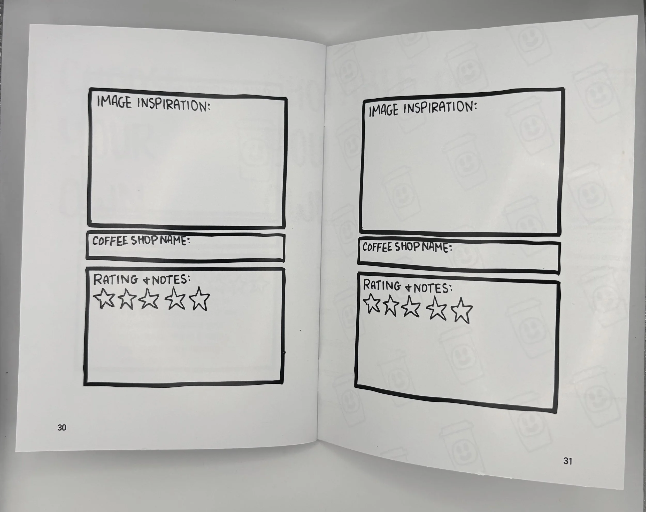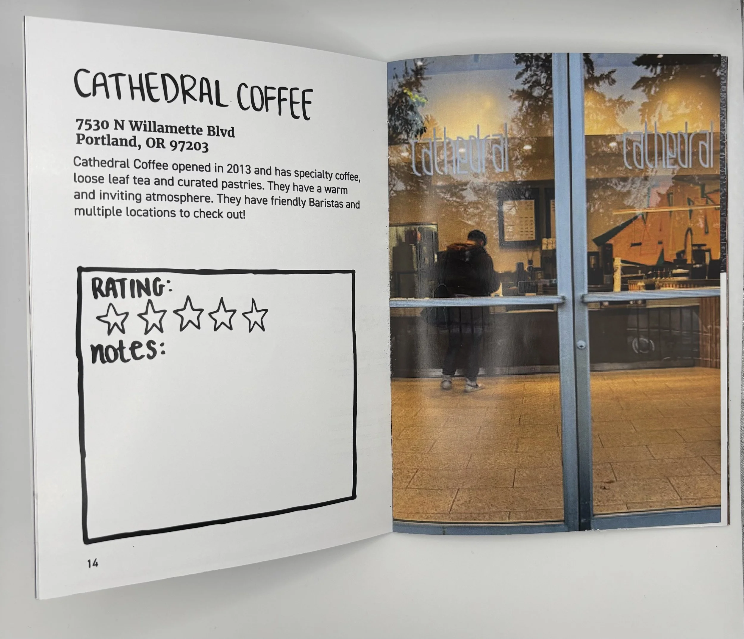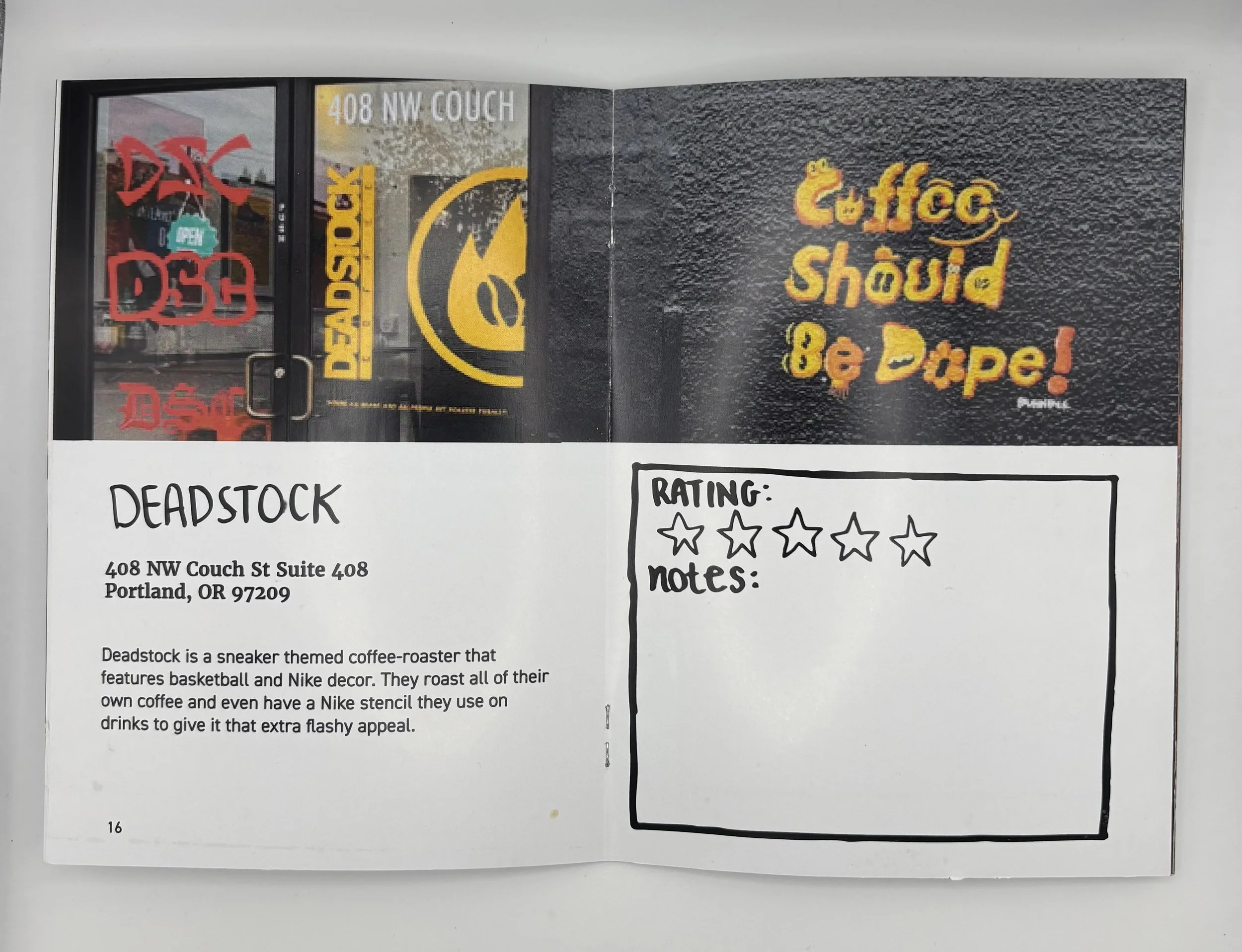 This is my thesis project. I wanted to find the best coffee shop in Portland, so I went on Reddit to get some recommendations. I compiled a list and visited nine of the most highly recommended coffee shops in town. This is a guide that people can fill out and capture their rating. There are blank spreads at the back, allowing you to add a coffee shop of your choice.