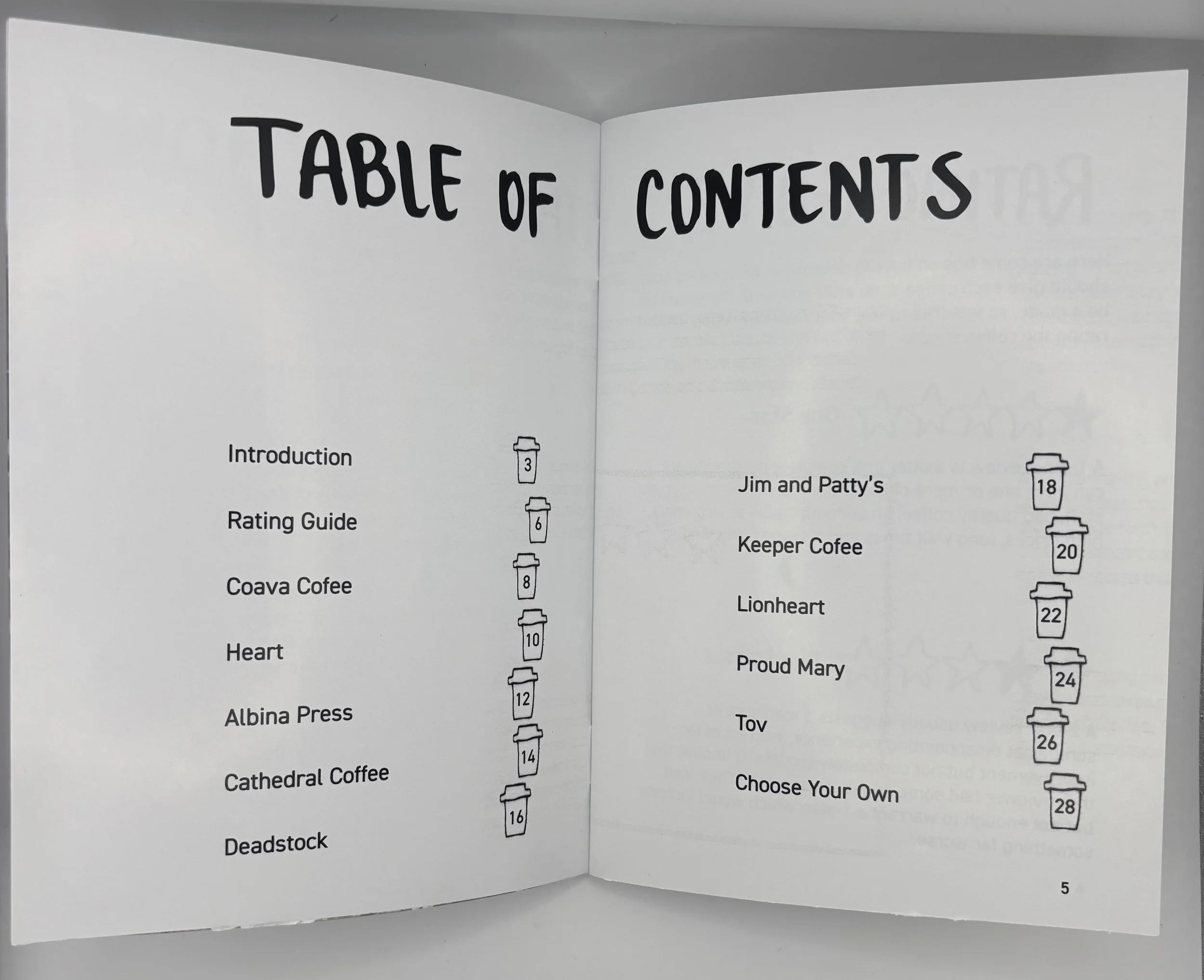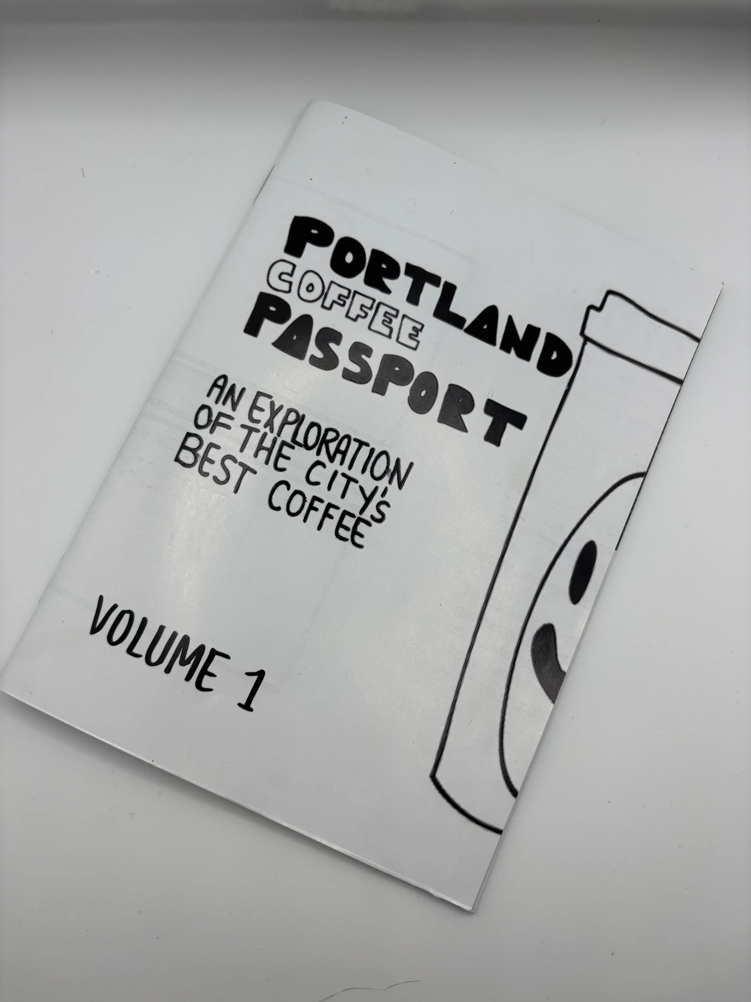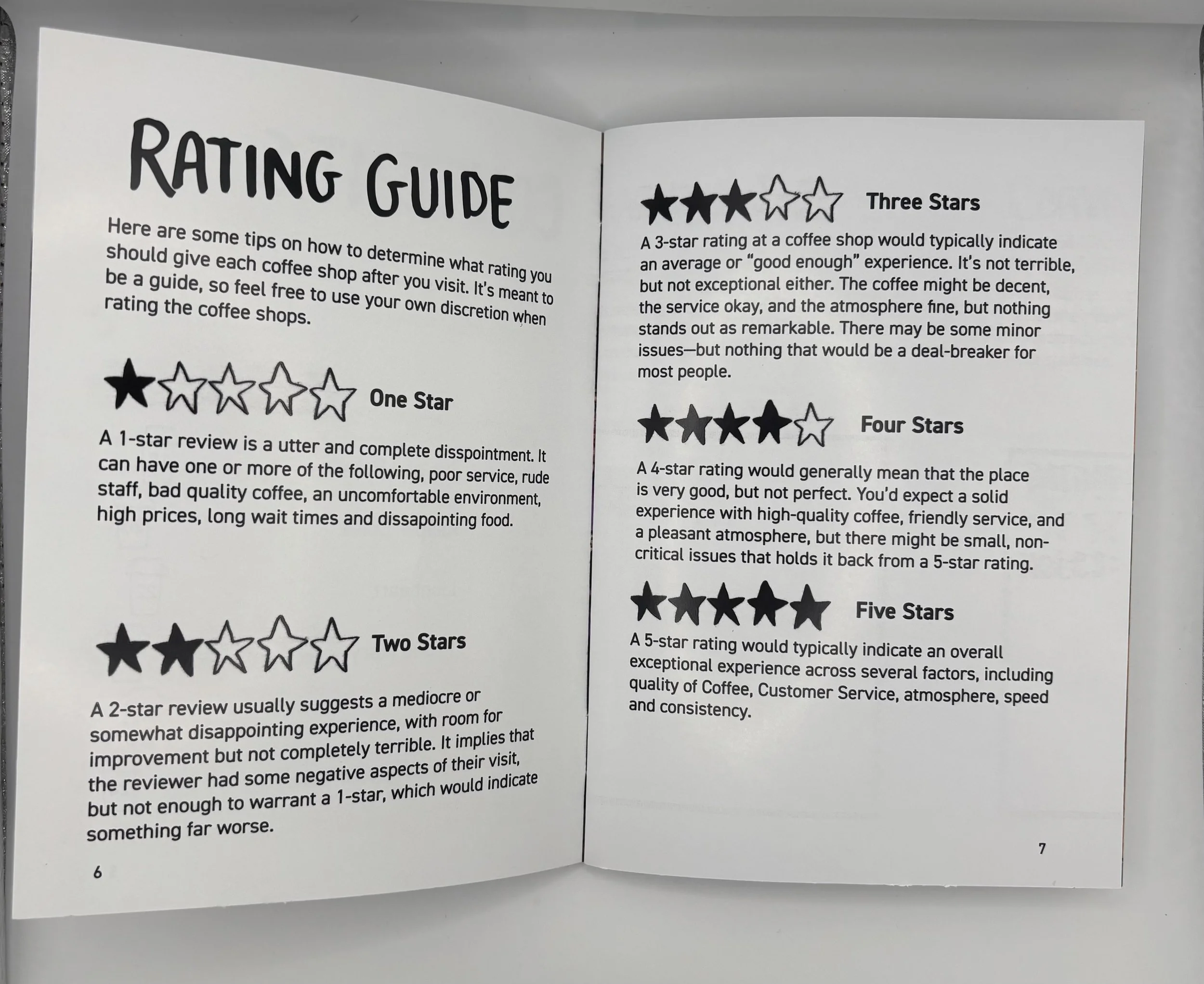 This is my thesis project. I wanted to find the best coffee shop in Portland, so I went on Reddit to get some recommendations. I compiled a list and visited nine of the most highly recommended coffee shops in town. This is a guide that people can fill out and capture their rating. There are blank spreads at the back, allowing you to add a coffee shop of your choice.